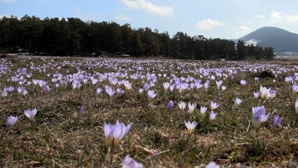 Köroğlu Dağları’nın eteklerinde yer alan yaylaya, mavi çiçekler ile yeşil alanların üzerini kaplayan çiğdem çiçekleri renk kattı. Sarıalan Yaylası’nda meraların